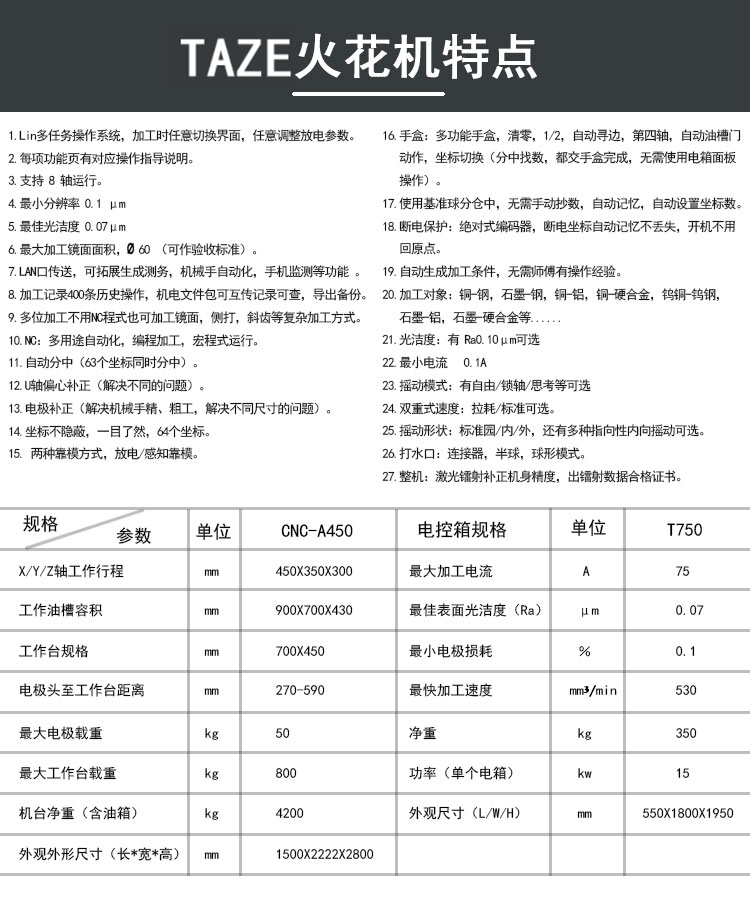 公司主要產品有TAZE火花機、鏡面火花機、牛頭式火花機、加工中心、三軸鏡面火花機、單軸高速鏡面火花機、電火花機、雙牛頭式放電加工機、雕銑機、穿孔機、線切割機、銑床、磨床、車床、搖臂鉆等模具通用設備。